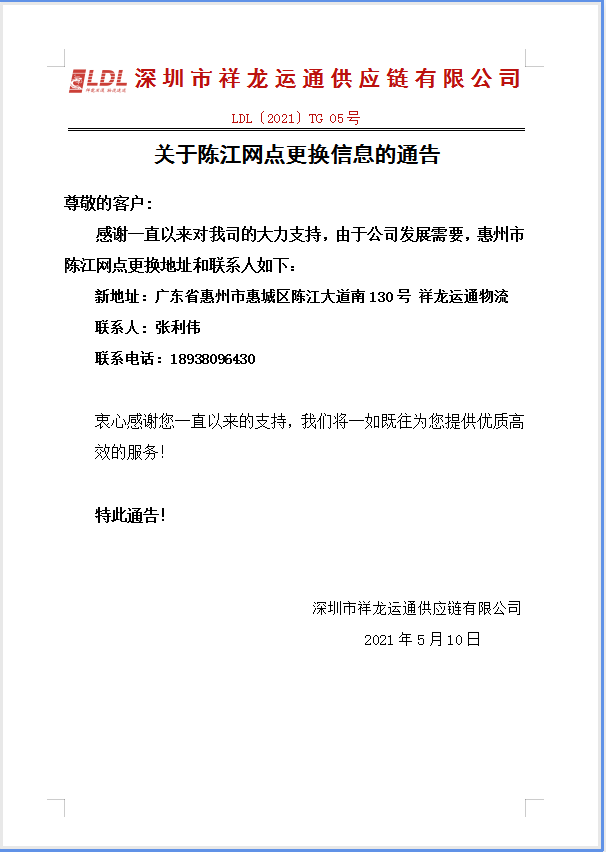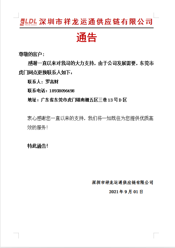 尊敬的同行客戶(hù)朋友; 感謝一直以來(lái)對(duì)我司的大力支持!由于公司發(fā)展需要,東莞虎門(mén)網(wǎng)點(diǎn)更換聯(lián)系人如下; 聯(lián)系人;羅高材。電話(huà)18938096498 地址;廣東省東莞市虎門(mén)鎮(zhèn)南柵五區(qū)三巷13號(hào)D區(qū)...
